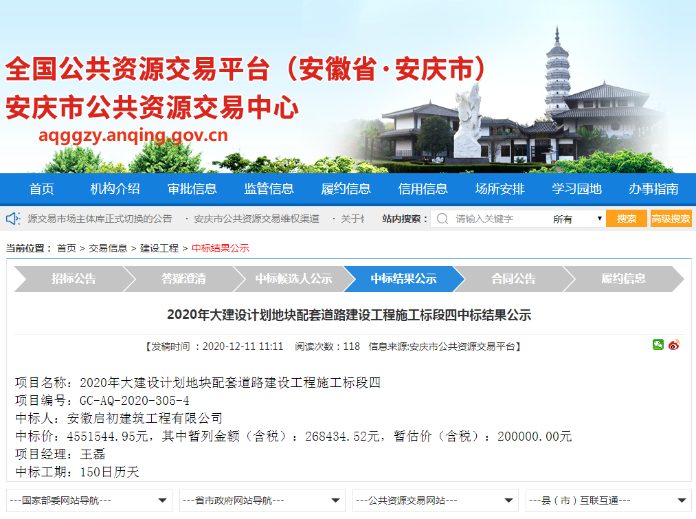 2020年大建設計劃地塊配套道路建設工程施工標段四中標結果公示